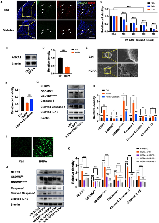 图1 ANXA1在糖尿病牙周炎中随巨噬细胞的增生而降低。(A)牙周组织切片免疫荧光双染色。 (B)巨噬细胞用LPS(500ngm l−1)和对照BSA(5.5mmol l−1葡萄糖)或不同浓度的PA(25.5 mmol l−1葡萄糖)处理不同时间,并用CCK-8测定法进行评价。(C)免疫印迹法检测对照组和HGPA组巨噬细胞ANXA1和β-actin的表达。(D)(C)的统计分析。(E)扫描电镜图像显示HGPA处理后巨噬细胞的形态发生了改变。(F)LPS(500 ng ml−1)和对照BSA(5.5mmol l−1葡萄糖)或200µmol l−1浓度PA(25.5mmol l−1葡萄糖)或200µmol l−1浓度PA(25.5 mmol l−1葡萄糖)和双硫仑处理的巨噬细胞的CCK-8测定。(G)对照组、HGPA组和HGPA+双硫仑组巨噬细胞的NLRP3、GSDMD全长、GSDMD-N末端、Caspase-1、裂解Caspase-1、裂解IL-1β和β-actin的免疫印迹图像。(H)(g)的统计分析。(I)通过DCFH-DA测量细胞内ROS生成。(J)对照组、HGPA组、HGPA+siNLRP3-1组、HGPA+siNLRP3-2组和HGPA+siNLRP3-3组巨噬细胞的NLRP3、GSDMD全长、GSDMD-N末端、Caspase-1、裂解Caspase-1、裂解IL-1β和β-肌动蛋白的免疫印迹图像。(K)(j)的统计分析。