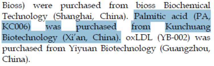 文中采用棕榈酸(钠)(PA)作为高脂细胞添加剂(货号KC006,Kunchuang Biotechnology)作为游离脂肪酸(free fatty acids,FFAs)处理细胞。棕榈酸(钠)(PA)作为脂毒性诱导剂,在细胞实验中用于模拟糖尿病高脂环境(浓度200μM,处理24小时)。