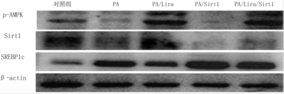 与对照组比,PA组细胞p-AMPK和p-Sirt1蛋白表达下调,而SREBP1c表达上调;与PA组比,PA/Lira组p-AMPK蛋白表达上调而SREBP1c蛋白表达下调;与PA/Sirt1组比,PA/Sirt1/Lira组细胞p-AMPK表达上调(图2)。